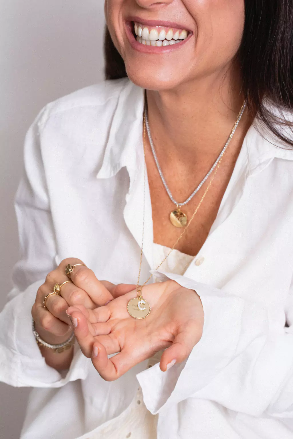 Pingente em ouro 18k com inicial em Diamantes Brancos na escolha do cliente e plaquinha onde é possível fazer a gravação como o cliente desejar. Podemos gravar até 8 palavras na frente e 8 palavras no verso da medalha torcida. A medalha mede 2 cm de largura e a inicial mede 1cm. A peça pesa 6 gramas de ouro aproximadamente.