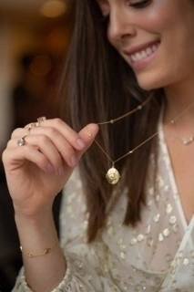 Pingente em ouro 18k medindo 2 cm de altura por 1,6 cm de largura. Na parte da frente do relicário temos o olho grego com uma pedra de Topázio Branco. A parte posterior podemos colocar o que o cliente desejar – uma frase, datas especiais ou nomes.